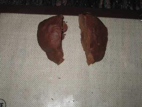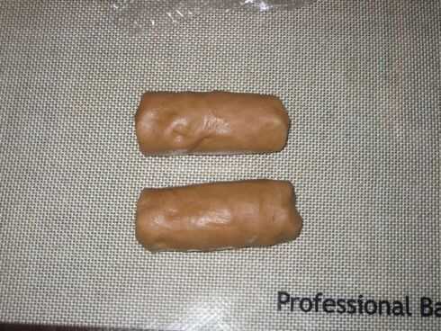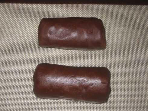 Con la masa de chocolate, hacer dos cilindros. Me parece que hacer dos cilindros le permite manejar la masa más fácil que hacer un rollo grande.