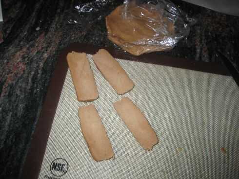 Dos de las porciones de 1/3 de la masa de vainilla Roll en pequeños cilindros que son la misma longitud que el cilindro de chocolate. Cortar cada pieza a lo largo, para que tenga cuatro pedazos de masa de vainilla que son la misma longitud que la masa de chocolate.