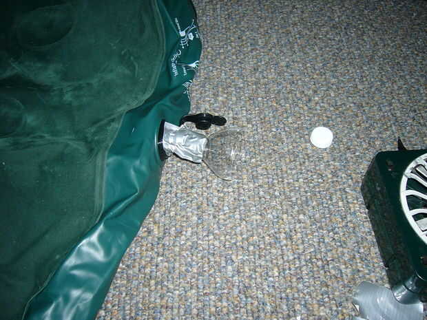 Ahora, pegue la abertura de la botella (el inyector de relleno) a la apertura sobre el colchón de aire.