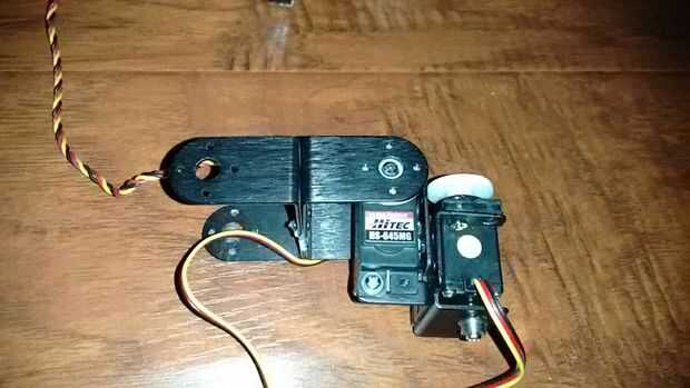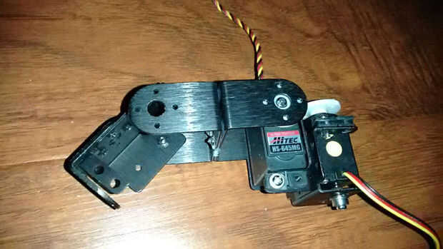 En primer lugar, colocar un servo HS-422 hacia el lado con los rodamientos de bolas y asegúrese de que la cabeza del servo es directamente sobre el cojinete de bolas (esto es muy importante). Luego instale el soporte de servo de C en el soporte de servo multiuso como se muestra en la segunda foto. Después de las 2 piezas colocados juntos, poner el capítulo 645 MG en como se muestra en la tercera foto. Finalmente Instale el soporte de servo de L en el lado izquierdo del soporte de servo de C como se muestra en la figura 4. Nota: es muy importante que ponga el servo derecho en el lugar correcto o de lo contrario afectará el rendimiento del robot.