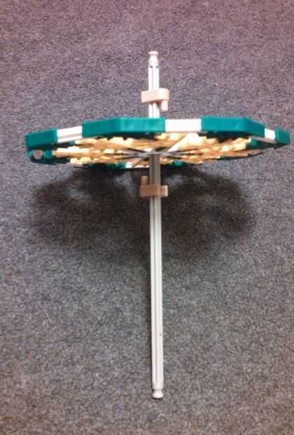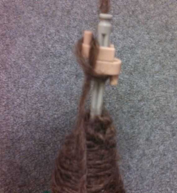 La espira tiene una tendencia a deslizarse por el eje (especialmente si son hiladoras de lana "en la grasa"), razón por la cual este diseño sólo es conveniente para hacer una espira inferior del huso, no una superior. Si te molesta, puede añadir más clips o espaciadores del eje por debajo de la espira. Yo sólo empujarlo hacia arriba otra vez si llega a estar demasiado bajo.