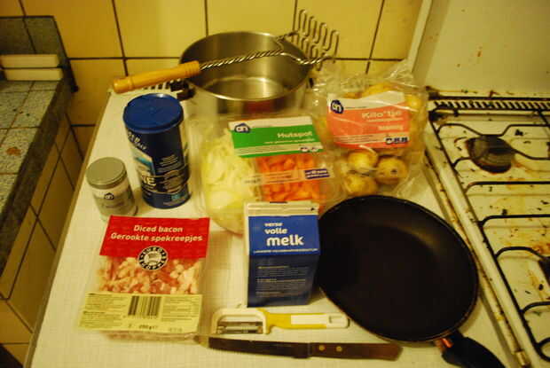 - cebollas y zanahorias: hutspot b y c se come mucho más de aquí existen los cuadros preparados prácticos. Para cualquiera que no viva en Holanda: Si usted compra una bolsita de zanahorias pequeñas (quizás uso sobre 3/4tas) y unos 5 cebollas blancas (sólo pequeño o medio, uso 4 Si la cebolla es muy grande), que será suficiente. Lo que vas es que las zanahorias un poco más de cebolla y sobre el mismo volumen en zanahorias + cebollas como papas.