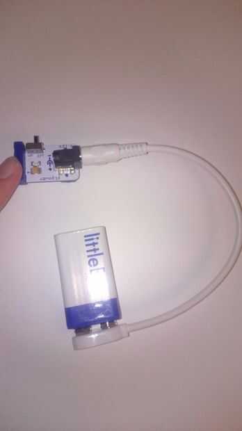 La etiqueta Slå dit littleBits batteri og det hvide cable og sæt dem sammen.
