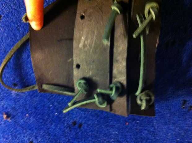 la i rosca cordón de cuero a través de los orificios de mi pedazo de dedo para hacer lazos para mis dedos