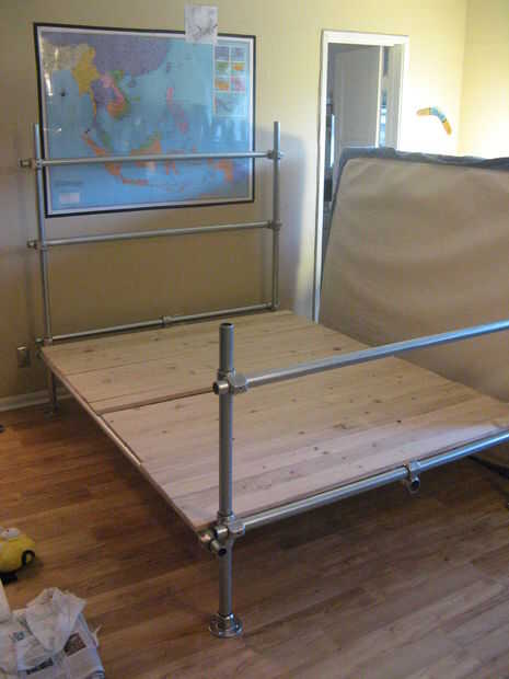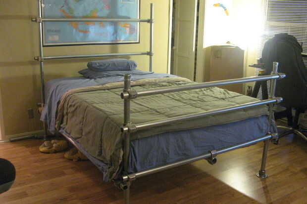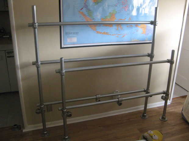 Fondo: Mi idea original era utilizar tubos de aluminio para crear un marco lo suficientemente grande como para una reina pero use tuberías Slip-on de crossover para que fácilmente puedo ajustar y desmontar cuando quiera ya que me muevo mucho. Quería las cabeza piernas para ser más largo que las piernas la cola y la base que un par de pulgadas más y más ancha que mi cama. Quería evitar a toda costa Home Depot pero no pude encontrar un lugar que venden tubos de aluminio. ¿El costo total terminó siendo alrededor de $400 para las guarniciones de Kee Lite, $100 para las tuberías EMT, $20 para las tapas de la pierna, $30? para los listones de madera. Tengo prácticamente sin herramientas adecuadas y vivo en un estudio pequeñito así que estaba como en hacer un montón de cosas que realmente quería hacer. También planeé este proyecto horriblemente debido a mi impaciencia entre otras cosas.