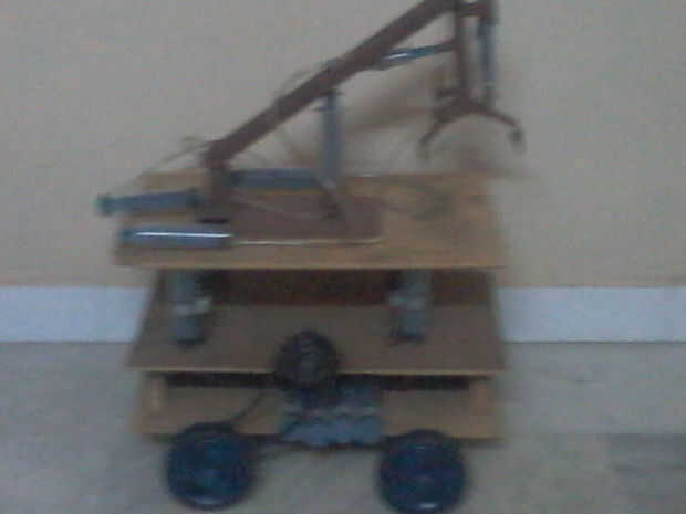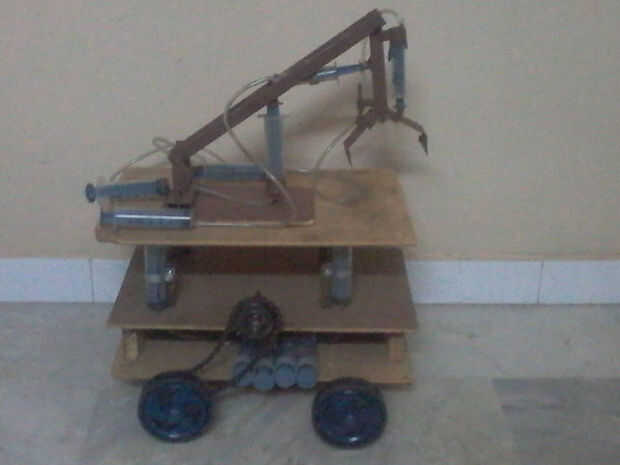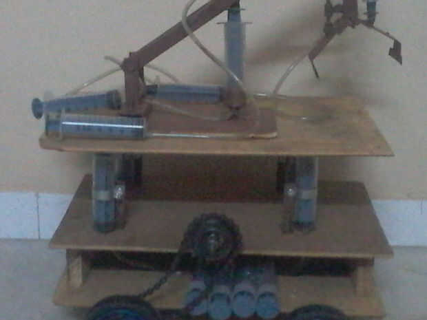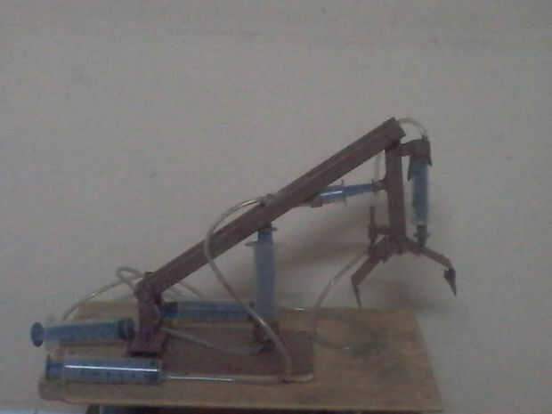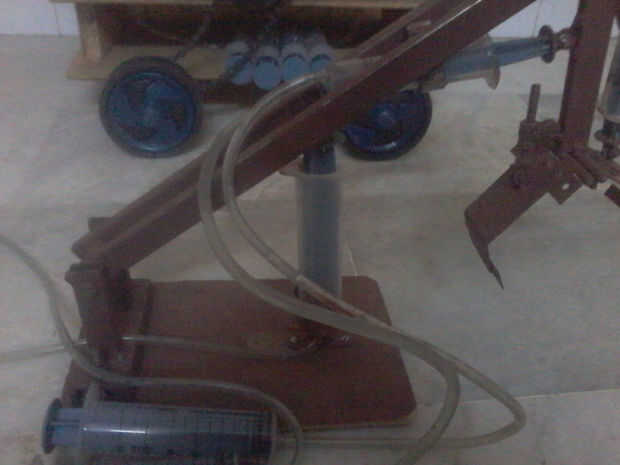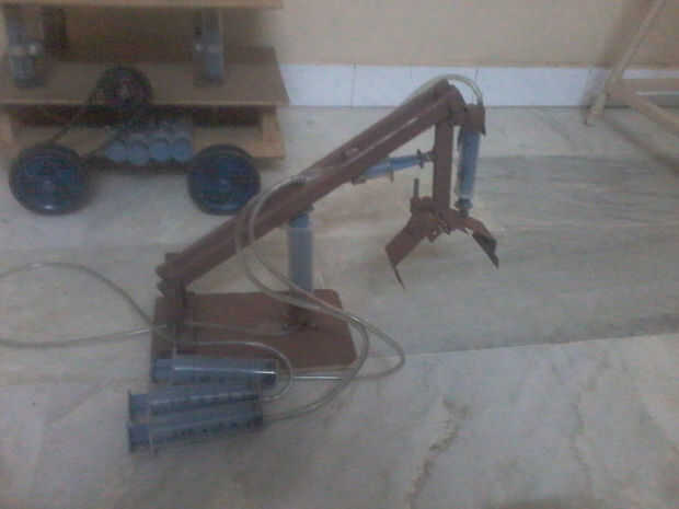 Grúa hidráulica por: Martin, Niklas, Andreas y Kristian.Cómo hacer una grúa hidráulica con 600 x 600 x hoja de mdf de 6 mm. dos surringes, un tornillo y un tubo de plástico.Esta grúa fue diseñada con solidworks, lazer cortado y montado para un proyec