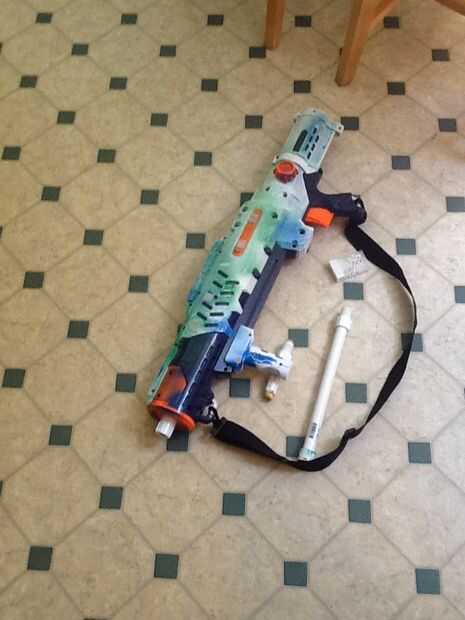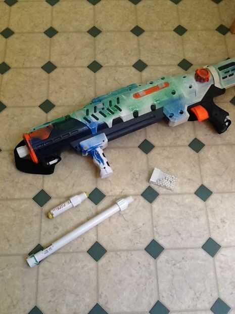 Nerf super soaker hydro cannon es una grande e impresionante blaster, tienen buen potencial Add un pvc tubería puede tiro normal dardos, dardos de mega, misil ha...pero necesita bomba 20 más un tiempo. muy atado. la bomba es muy muy tiny.so actualiza