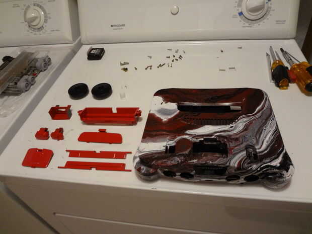 Rocía la pintura en el agua a partir del centro & aerosol para tal vez 15 segundos antes de cambiar al siguiente color. ¡ Con cada color rociar el mismo punto que empujó el color antes de hacia fuera en el agua en una especie de anillo que es lo que conduce al patrón de remolino, siendo posible. Luego de aerosol más áreas de pintura alrededor el punto que empecé más cerca al borde de la bañera de la misma manera el centro. Una vez que me sentía que tenía suficiente pintura sobre el agua entonces solía un palo pintura arrastre a través de la pintura en un movimiento circular para conseguir un diseño que me ha gustado mucho en la parte superior del agua. Tuve las mitades de consola atornilladas así el patrón iría alrededor de la cáscara entera por lo que correspondería con. Por esta razón se requiere de una gran bañera. Hay mucha superficie para que tenga que imaginar la pintura en el agua de embalaje alrededor de la cáscara entera como usted inmersión. Yo usaba guantes de látex y llevó a cabo la consola por la parte interna donde el av multi out puerto normalmente es localizado y llevó a cabo la cáscara en un ángulo como poco a poco lo sumergió en el agua. Torcí un poco, bajé para hacer los colores van en una dirección deseada alrededor de la carcasa de la consola. Una vez que estaba completamente sumergida I lentamente agitó alrededor un poco y utiliza el stick de pintura para mover los colores restantes en la parte superior el agua fuera del camino por lo que tendría un camino limpio para tirar la cáscara de nuevo sin tener que preocuparse de recogieron ya pintura. Voy dejar las piezas secar al sol por varias horas durante 2 días. Durante ese tiempo pintar de rojo las partes más pequeñas y los deje secar varias horas en el sol así.