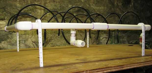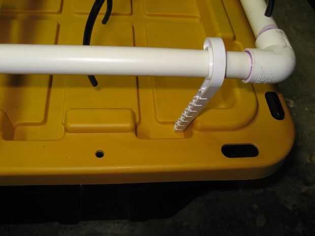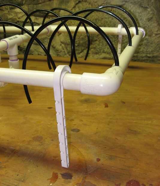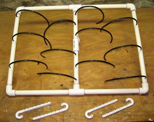 Clip de una 1/2" PVC gancho colgador aproximadamente 1" de cada uno de los codos de 90 grados como se muestra en las fotos segunda y terceros. Era muy difícil encaje en los ganchos de j, pero una vez en hicieron agradables patas para el montaje.