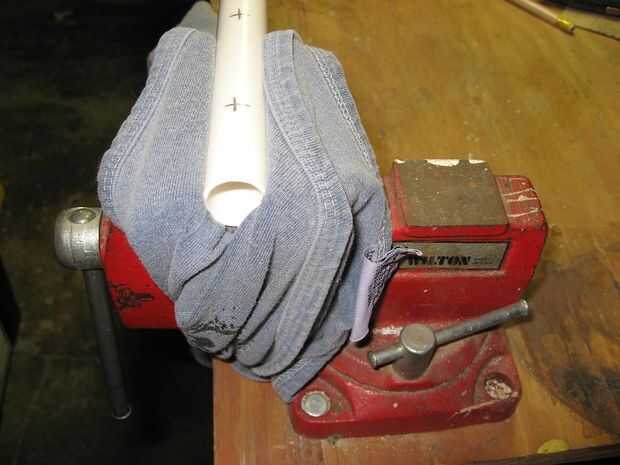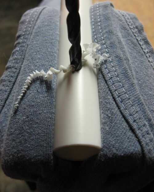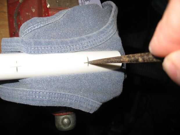 Un vicio abrazadera puede ser útil en este punto. Abra las mordazas ligeramente más que el ancho del tubo de PVC. Pone una camiseta vieja sobre las mordazas y presione el tubo de PVC en las mordazas de sujeción como se muestra en la segunda foto. Apriete la abrazadera lo suficiente como para sostener la tubería de PVC (no quieres crackearlo). Ahora utilizar un punzón o clavo para aplicar sangría el tubo de PVC en una de las marcas (ver tercera foto). Usando la broca en el último paso, taladre a través de un lado del tubo de PVC (no taladre a través de la parte posterior del tubo de PVC o tienes una fuga en sus manos!). Repita estos pasos para todas las 12 marcas.