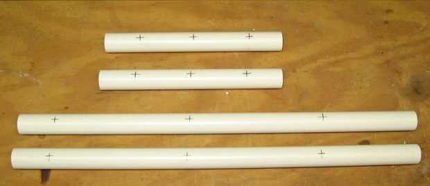 Ahora toma las dos piezas de PVC más cortas (7 5/8" piezas en mi caso) y marcas de lugar 1 1/2" de ambos extremos de ambas piezas en el mismo lado. Una vez que has hecho ese lugar uno más marca a medio camino entre las marcas de dos extremos. La ubicación de las marcas debe asemejarse a los de la primera foto.