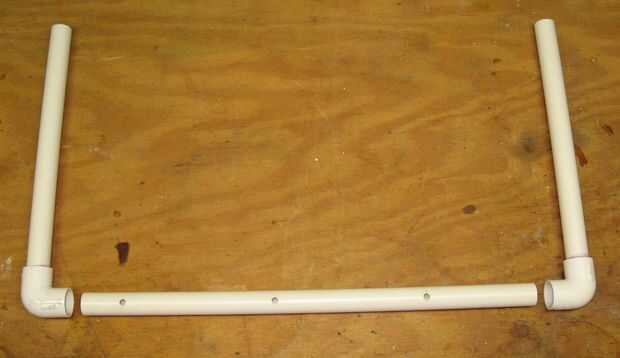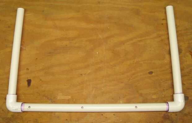 La segunda foto muestra cómo colocar dos de las piezas ensambladas en la primera foto a uno de los largos tubos de PVC con perforaciones. Montar un lado en un momento. Al montar el primer lado Asegúrese de que los taladros punto estrecho, de la superficie de trabajo que se muestra en la segunda foto. Permitir que un par de minutos para el empalme de la curación. Entonces Únete al segundo codo a la tubería larga. Manteniendo la articulación en su lugar, rápidamente Presione la unidad completamente ensamblada sobre una superficie plana antes de que se seque el cemento. Codos, así como los dos extremos de tubo abierto deben tocar la superficie de trabajo como se muestra en la tercera foto. Si no toque todo el montaje final de PVC se ladeó.