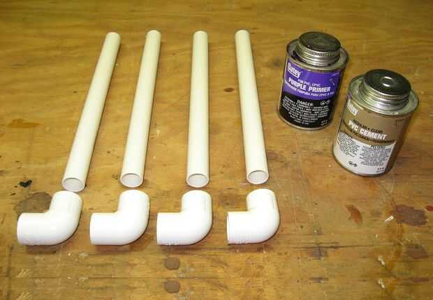 Instale un codo de PVC de grado 90 al final de cada una de las 4 piezas medianas sin perforaciones (primera foto). Una vez que se unen las conexiones, permitir que el cemento curar para un par de minutos antes de proceder.