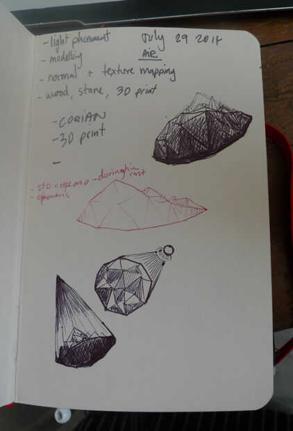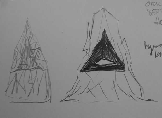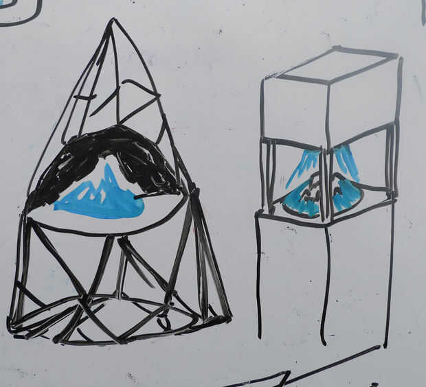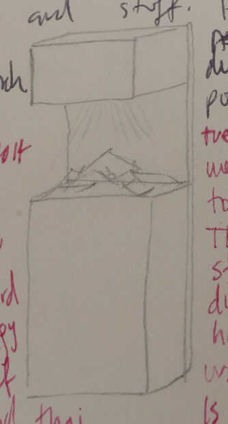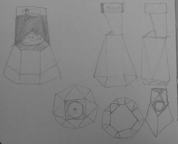 Para ejecutar este concepto, comencé a esbozar ideas para dioramas y escenas miniatura. También debían incluir una computadora encajada y proyector en algún lugar para aumentar el tiempo y el lugar de una escena. Comencé con construcciones cuadrado como diorama y variados hasta partes de picos y Torres.