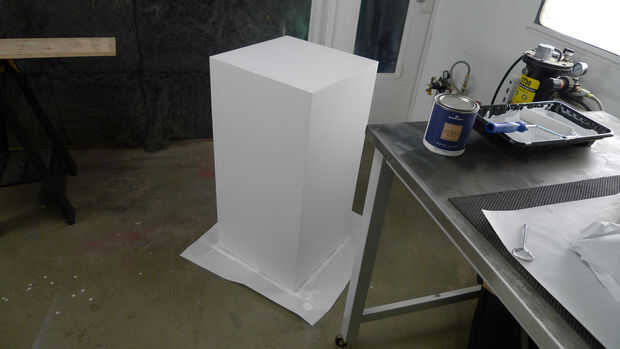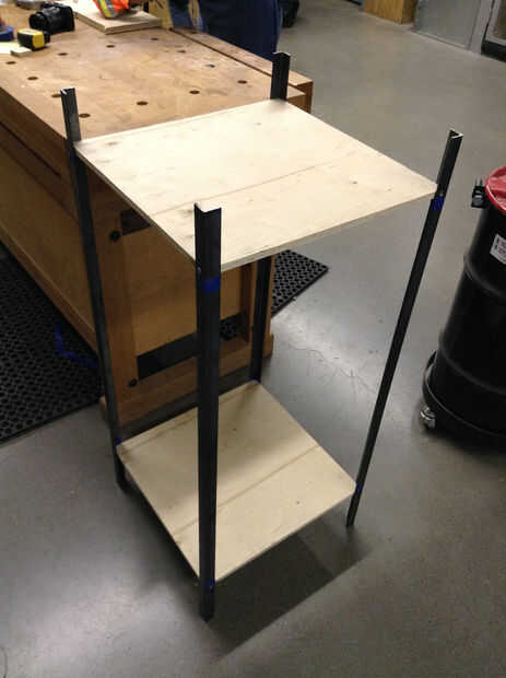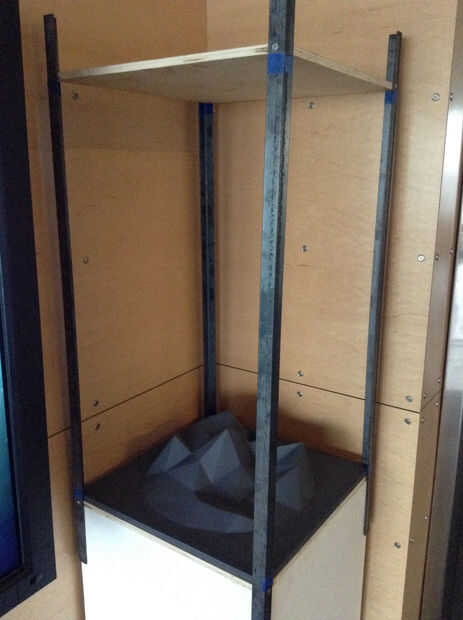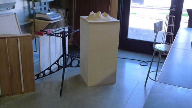 Pasé por unas cuantas iteraciones para crear una estructura para el proyector y la computadora. Empecé con un basamento cúbico básico y acero derecho-anguloso a escala y proyector de tiro correcta. Esto me permitió proyector tiro con mi modelo de proyector.