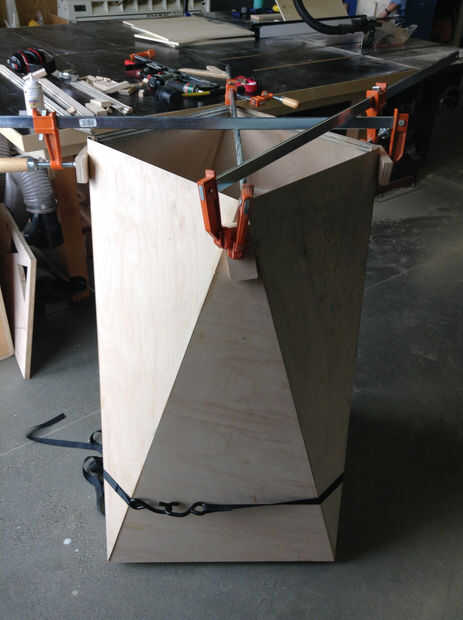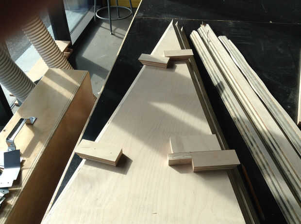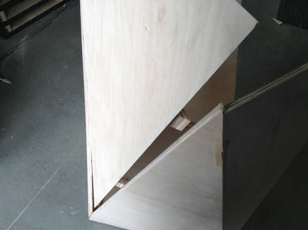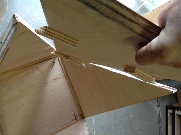 He creado una serie de cuñas que brad clavada/pegada en los paneles de inglete y luego les cayó en los montantes verticales que ya fueron Unidos a la base. Gravedad y abrazaderas celebraron los paneles en forma segura mientras el pegamento fijar un día para otro.