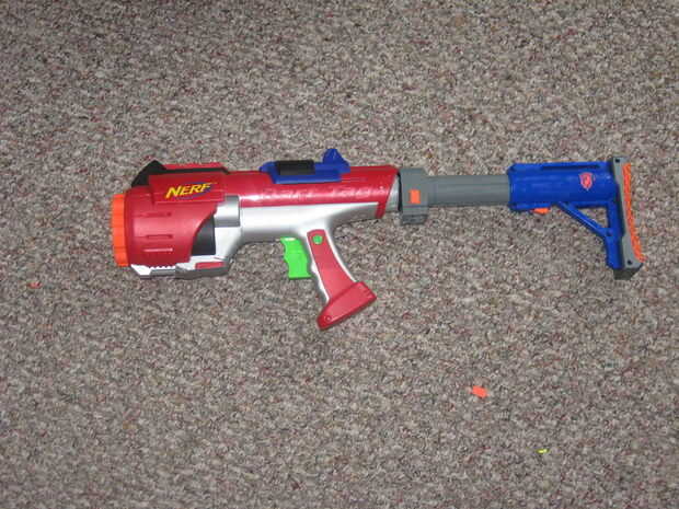 skilletI me voy a mostrar como a mod la nerf hiper fuego. Primero necesitas la pistola. Entonces necesitas una sierra. Pegamento caliente pistola y cinta adhesiva. Lo negro en la parte posterior de la recon cs6 y el nerf raider.