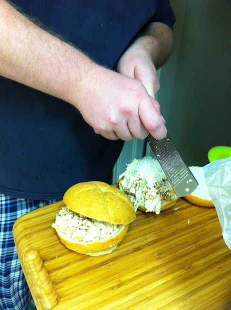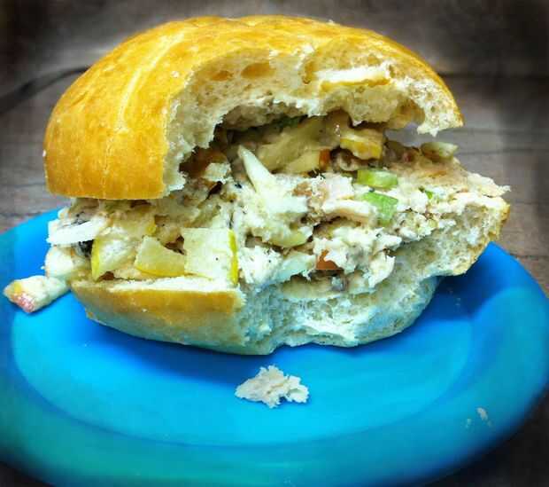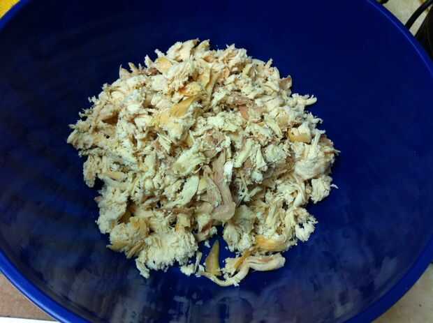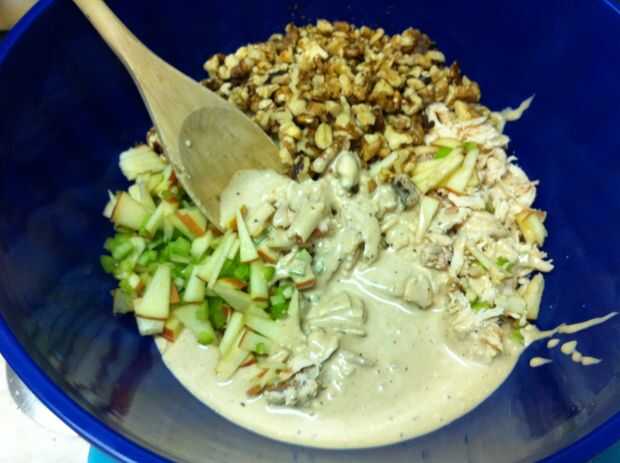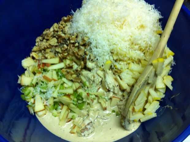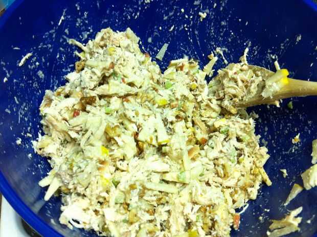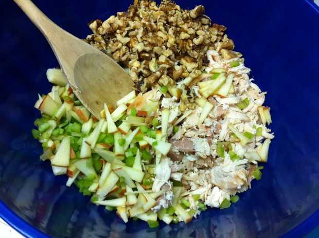 Tengo un amigo picar las manzanas y el apio. Exprimir el medio limón sobre las manzanas y cortar antes de que termine. Saque la carne de pollo con cuidado de los huesos y otros tejidos conectivos menos deseables, triturar un poco y picar los trozos más grandes. Poner el pollo en un recipiente grande, lo suficientemente grande para revolver la mezcla entera más tarde sin derramar.