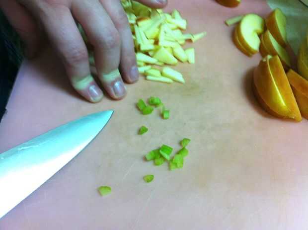 Manzana Fuji no es la única clase de manzana digno de comer, pero es uno de mis favoritos. El sabor a manzana dulce, agrio y vibrante de esta variedad es lo suficientemente audaz como para sostener sus el propios contra los otros ingredientes que compiten, y la textura es perfectamente firme. La manzana debe ser cortadas en trozos pequeños - pueden ser algo largos, pero debe ser no más gruesos que un guisante. No cortar en cuadritos la manzana. Se debe ser izquierda sin pelar (en situaciones óptimas) para incluir el apple completo sabor y textura, pero dados pedacitos de manzana tendría demasiado pequeño una carne a proporción de piel a ser aceptable. La textura de la piel de manzana requiere una buena cantidad de carne de la manzana para contrarrestar su tacto fino pero correosa. Trozos se demasiado desigual distribuiría, con algunos bocados de ensalada de pollo que apple casi todos, mientras que muchos otros bocados tienen ningúno. Esto también va para la pera asiática y apio - cortar las piezas pequeñas. Te sugiero cortar la manzana y la pera en secciones, quitar todos los bits de los compartimientos de la base y las semillas y luego cortar las secciones en trozos, que contener un poquito de cáscara de manzana.