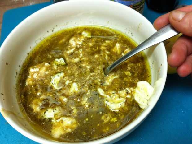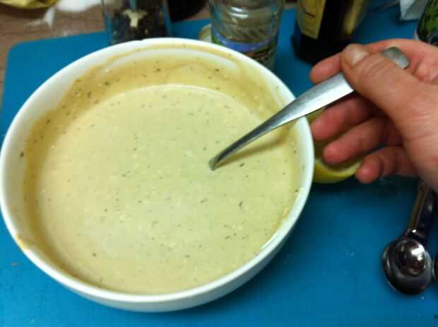 Mezcla mayo, aceite de oliva, vinagre, vinagreta, chalota, tomillo y pimienta negra junto, en un recipiente separado, o derecha en el recipiente grande con el pollo. Exprimir la otra mitad del limón (a través de un pequeño filtro para atrapar las semillas) en la salsa. Generalmente no uso un tazón por separado, pero no me imaginé que personas podrían usar imágenes de la salsa en un recipiente separado para ver cantidades.