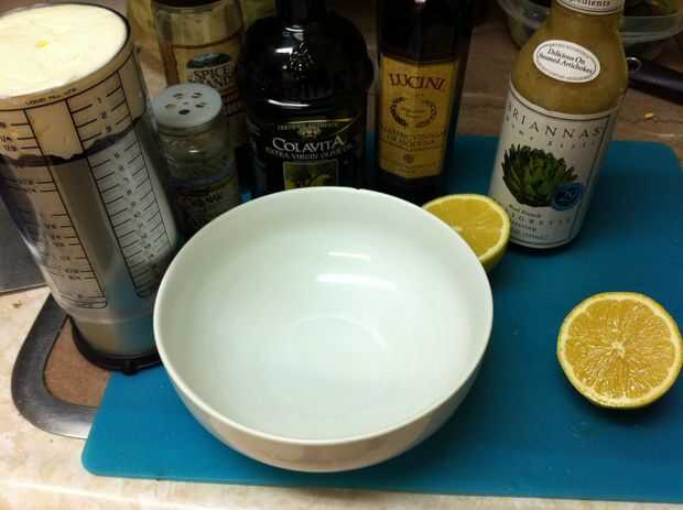 3/4 C Brianna francés vinagreta, la clase con la ilustración de la alcachofa en la etiqueta (utilizar más aceite, vinagre de champagne y hierbas secas si se salta este ingrediente)
