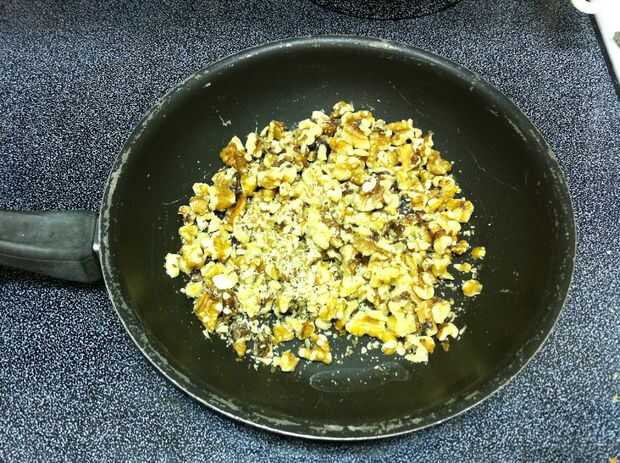 Picar y tostar ligeramente las nueces en una sartén seca sobre fuego medio, revolviendo con frecuencia. Añadir las nueces a la gallina. Si tu amigo ha terminado de picar las manzanas y el apio, añadir ese tipo de cosas.