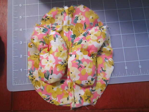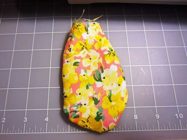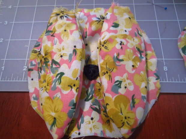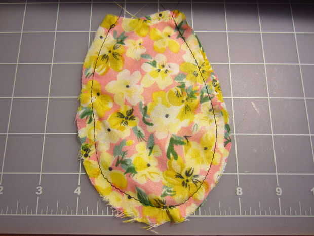 5. la cabeza tiene las orejas que se unirá al mismo tiempo que se cose. Use alfileres y fije las orejas hacia abajo y la cara. Tenga cuidado de no fijar demasiado cerca a su margen porque podría romper la aguja. Añadir la otra tela cabeza, revés, apuntando hacia arriba y fíjelas con pasadores de más.