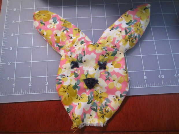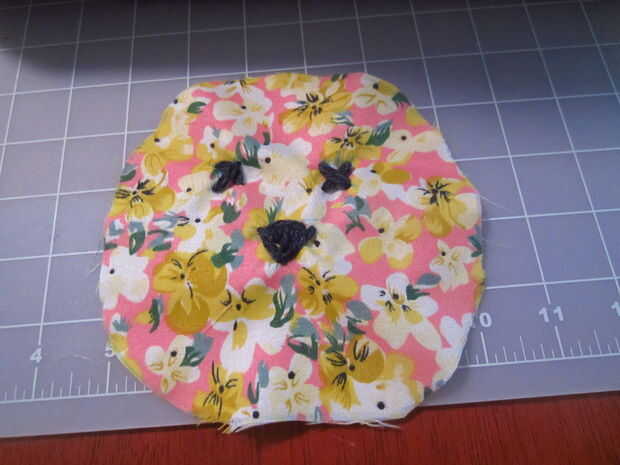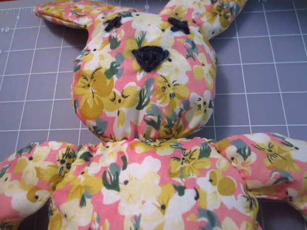 4. el Sr. Bunny tiene una cara antes de coser la cabeza. Dibujaba muy básico y que Xs para sus ojos y una boca abajo triángulo para la nariz. Entonces usé hilo en vez de hilo para coser la cara. Puedes optar por ser creativo aquí. Creo que al tiempo me gustaría añadir botones grandes, azul para los ojos.