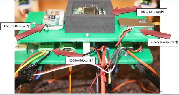 Motor número uno ESC debe su eliminador de batería circuito (BEC) ESC. Esto es donde la placa KK2.1.5 recibirán energía desde el sistema de batería. Si utiliza esta configuración puede que necesite añadir un filtro de vídeo para limpiar tu video. Puede uno barato en HobbyKing o construir su propio. No son difíciles de construir. Tienen algunos en Ebay, así.
