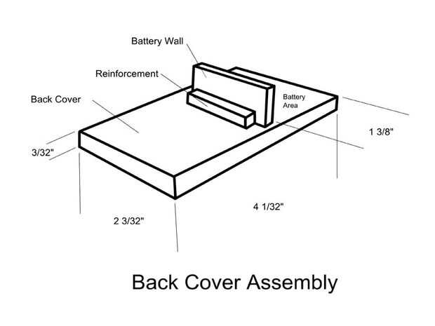 Utilice pegamento de acrílico para conectar la pared de la batería a la cubierta trasera. Encolar la pared batería 1 3/8" desde el borde inferior de la contraportada. Reforzar la pared de la batería con un pequeño trozo de hoja de acrílico de 1/8".