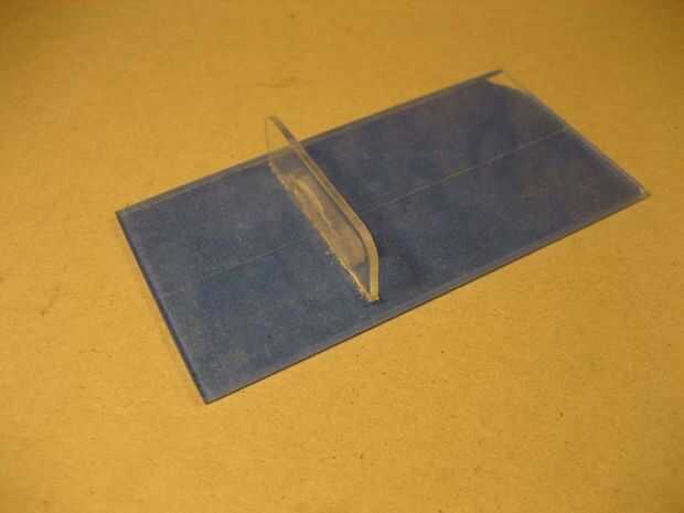 La siguiente pieza a fabricar es la pared de la batería. Para hacer la pared de la batería corta 5/8" por 1 3/4" pieza de hoja de acrílico de 1/16". Estas dimensiones son aproximadas. La pared de la batería no es un componente estructural por lo que no tiene que ser de un tamaño perfectamente. La pared de la batería es necesario simplemente para mantener la batería estable.