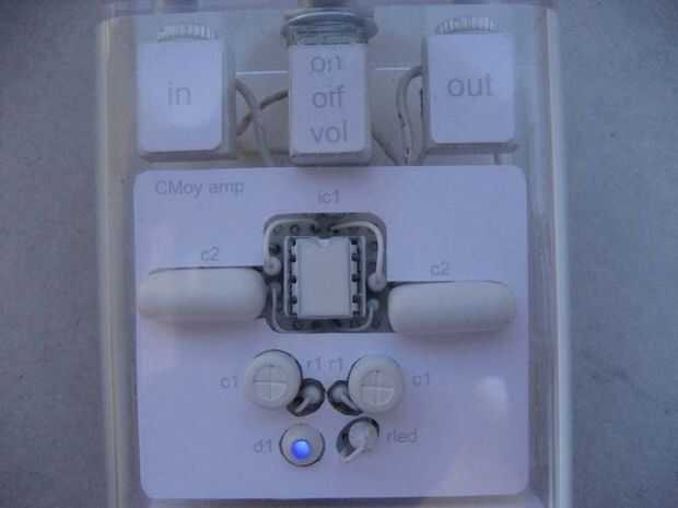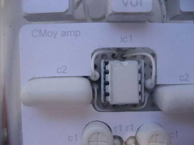 Para continuar con el tema de lavado blanco, crear un circuito de CMoy cubrir utilizando el mismo método utilizado para crear la tapa de la batería. Escanear la tarjeta de circuitos, uso de software como Photoshop para crear una máscara. Brindar corte salidas para los componentes de la placa de circuito. Incluyen etiquetas de componente si lo desea. Prueba con el papel, impresión, corte, prueba de ajuste, cambiar el tamaño y repetir. Cuando perfecto, imprima sobre papel fotográfico mate y recortarlo.