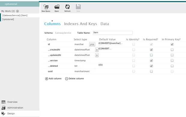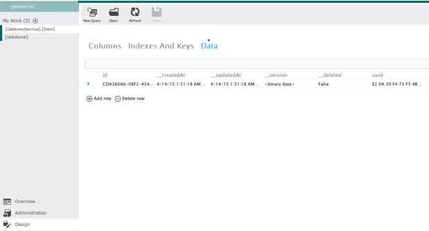 En primer lugar, ir a "Diseño" (abajo a la izquierda). Desde que hace clic en el enlace anterior, ya debe ser una tabla llamada "Elemento". Haga clic en "Editar". Ahora añadir una nueva columna llamada "uuid" y defina su tipo nvarchar (Max). Ir a la pestaña "Datos" y añadir una nueva fila. Establezca el identificador que usted desee. El uuid debería ser el uuid con el mayor y menor en forma hexagonal. Por ejemplo, si la aplicación dice el uuid es "E20A39F4-73F5-4BC4-A12F-17D1AD07A962" con un gran valor de "2" y un menor valor de "12", uuid de la fila sería "E2 0A 39 F4 F5 4B C4 A1 2F 17 D1 AD 07 A9 de 73 62 00 02 00 0C".