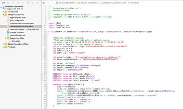 En el GitHub repositorio es una carpeta llamada BeaconAzureDemo. Esta carpeta contiene el proyecto de XCode para nuestra aplicación iOS Swift. Sí, usted tendrá acceso a un Mac con XCode en él. (Si no, véase la última página de este tutorial). Abra el archivo xcodeproj para comenzar.
