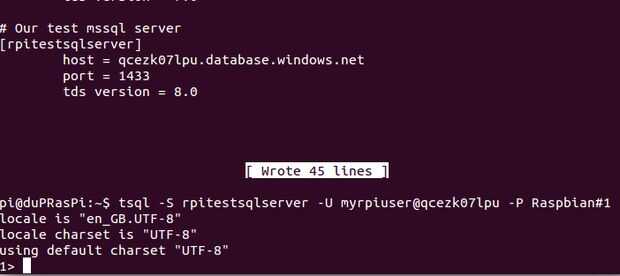 tsql -S rpitestsqlserver -U myrpiuser -P Raspbian#1
