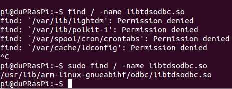 Antes de que podemos pasar al siguiente archivo de configuración, debemos localizar el driver dos archivos, libtdsodbc.so y libtdsS.so, cuyas ubicaciones son diferentes dependiendo de la distro de Linux. La utilidad de encontrar es mejor que grep para encontrar nombres de archivo, pero necesitan permisos de root para acceder a ciertos directorios de raíz, como se muestra arriba.