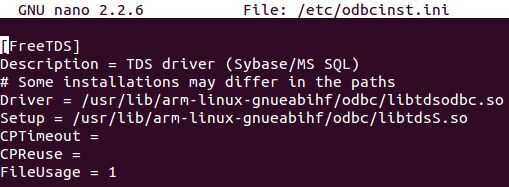 [FreeTDS] Description = TDS driver (Sybase/MS SQL) Driver = /usr/lib/arm-linux-gnueabihf/odbc/libtdsodbc.so Setup = /usr/lib/arm-linux-gnueabihf/odbc/libtdsS.so CPTimeout = CPReuse = FileUsage = 1