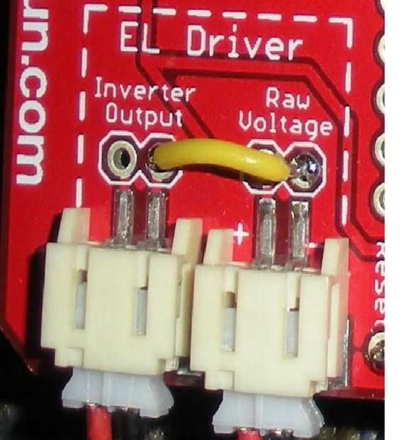 Finalmente, enchufe el conector JST que está conectado a los cables positivos y negativos del inversor de corriente en el enchufe de "(voltaje) crudo" en EL Escudo. Conecte el otro conector JST en el tapón "Salida del inversor" en EL Escudo.