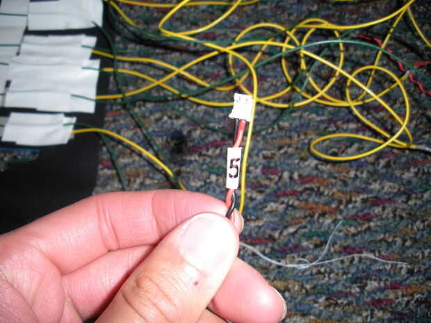 Ahora, envuelva un trozo de cinta adhesiva, cerca del conector de 2 pines, cada uno de los siete conectores JST. Etiqueta cada conector 1 a 7 con un rotulador permanente.