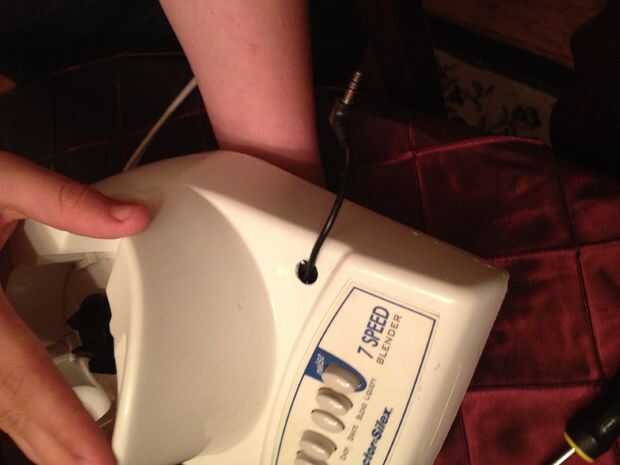Corte un pequeño agujero en la parte superior de su licuadora. Hacer todo grande lo suficiente para montar el altavoz enchufe a través de él,