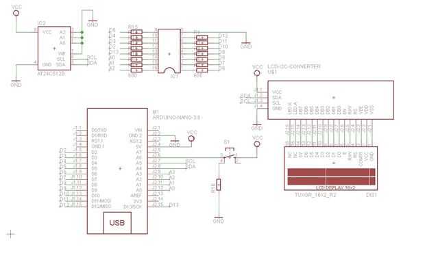 En primer lugar es el Arduino Nano. Debido a la cantidad de puertos disponibles el máximo de pines que se probará es 16 (que es suficiente para la mayoría de la IC). Para lograr esto, la comunicación a la pantalla LCD y la EEPROM que contiene los datos de prueba se hace vía I2C. El Nano tiene sobre la comunicación a la computadora para mostrar los resultados de la prueba detallada.