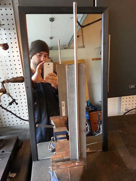 Para montar los espejos en el travesaño, pasé la cabeza mucho tiempo rascarse antes de instalarse en la solución final. Corté dos largos de acero plano al ancho de los marcos de los espejos. Taladré agujeros en las cuatro esquinas de cada uno a través del cual pasaría los pernos estrechos. Levanté la barra "vector normal" exactamente vertical y sujeta las piezas de acero plano en las barras de soldadura. Después de la soldadura, se rascó los patrones de orificios de acero plano en los marcos de los espejos. El "huso de la bisectriz" asegura que la unidad es "Fondo pesado" porque la polea se basa en la constante tensión leve.
