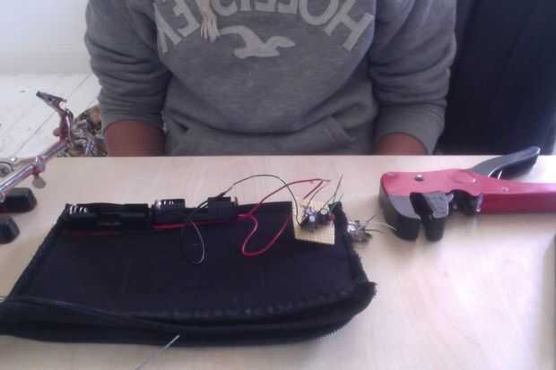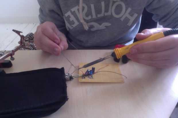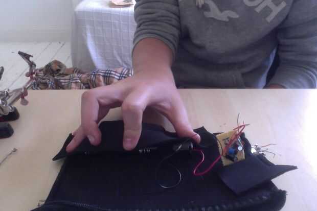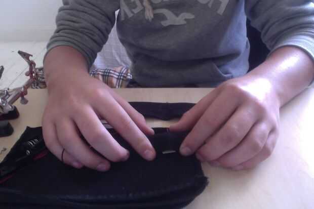 ahora tenemos que tomar la prueba el circuito y soldadura el usb los cables anteriormente en el usb hembra, y con agujeros de tornillo en el pcb coser el circuito en el interior de la caja, creo que es más fácil si usted apaga el caso adentro hacia fuera, que el usb y el circuito es seguro enchufando un cable , si solo empuja entonces usted necesita coser un poco más. Ahora, con el caso todavía revés tome ese pedazo de material de repuesto y las pilas y coser un bolsillo pequeño en la carcasa, rodean completamente el circuito y licencia y apertura de las baterías para que usted puede cambiarlos cuando ejecutan fuera del poder