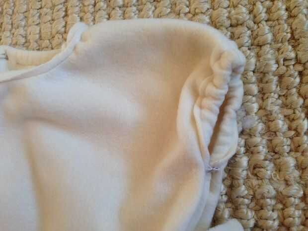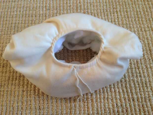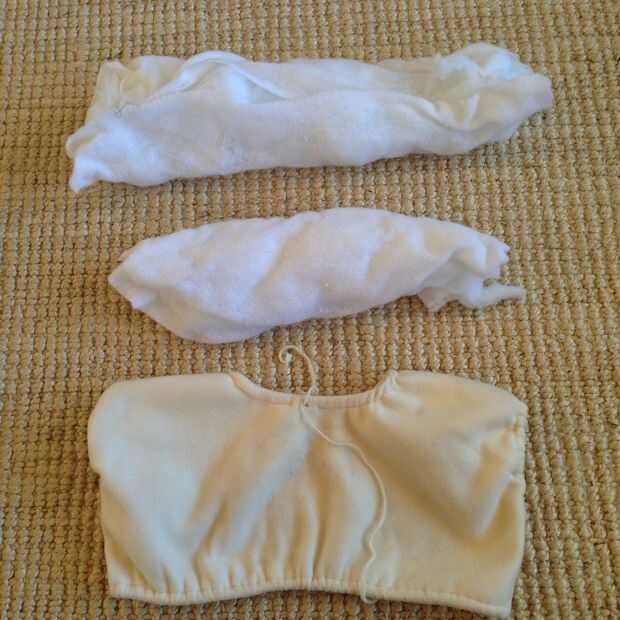 3. Derecho contra derecho, coser los lados hasta el corte del brazo. Hacer una pequeña cubierta para cuello, brazos y parte inferior del cuerpo para que pueda sinch en el cuerpo terminado. Enrosque un empate (hecho con una tira larga delgada de paño grueso y suave) a través del cuello y parte inferior del cuerpo. Añadir elástico a los brazos en lugar de una corbata.