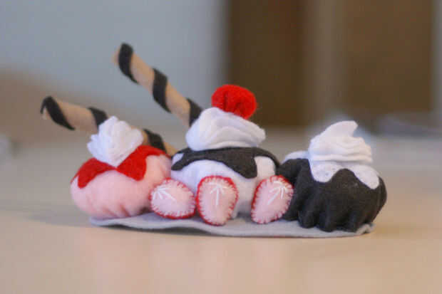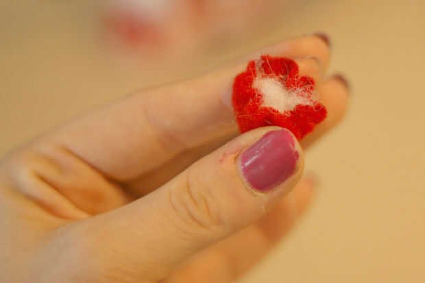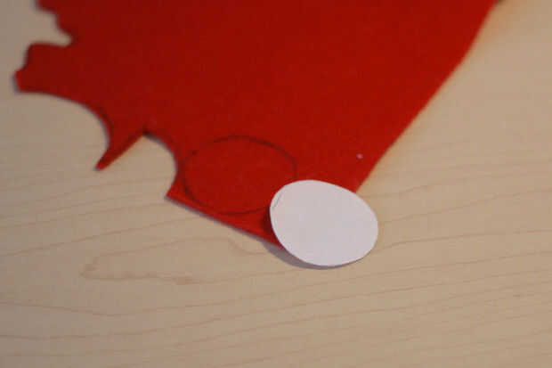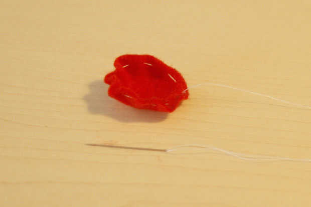 Cortar un círculo de fieltro rojo, coser una puntada de funcionamiento alrededor del borde exterior, se reunieron el círculo y había añadido fibra de relleno.