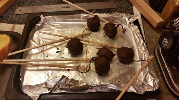 Antes de crear las trufas atan un extremo de cada longitud de guita a un palillo. Hice una pequeña muesca para ayudar a mantenerlo en.