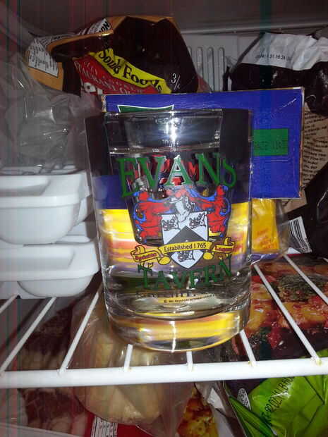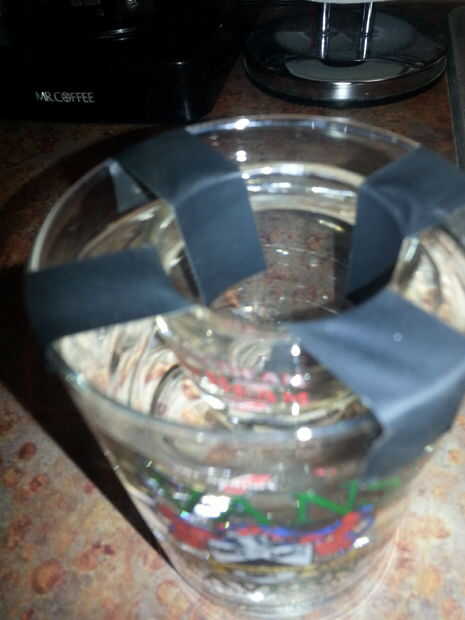 Ahora necesita añadir agua el vidrio. Asegúrese de que no entre agua dentro del vaso. Agua se expande al congelar así que mantenga la línea de agua de 1/4" debajo de la línea de vidrio de tiro. Si tienes algún colorante agregar unas gotas alrededor de la cinta y deje que se mezcle.