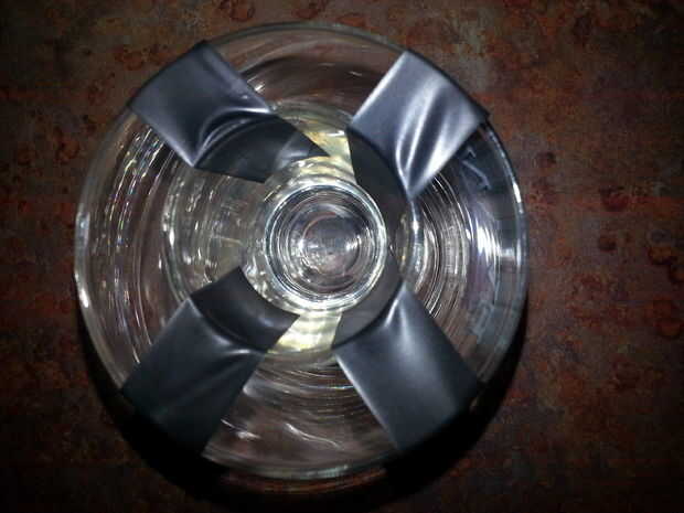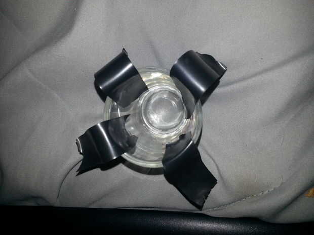 Comienza por cortar cuatro trozos de cinta - bonito mucho cualquier tipo funciona, eléctrica, conducto. Cortar unas 3 pulgadas mucho, mucho tiempo suficiente a la cinta el vaso y taza. Cinta adhesiva alrededor del vaso hasta la mitad hacia abajo con el exceso colgándose. Centro de su vaso en el centro del vidrio. Una vez centrado Asegúrese de que el vaso no esté tocando el fondo del vaso. Una vez tienes alineados cinta abajo todas las cuatro piezas de cinta hacia el exterior del vidrio. Esto hará que el vaso de chupito flotar dentro del vidrio.