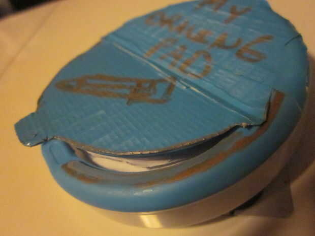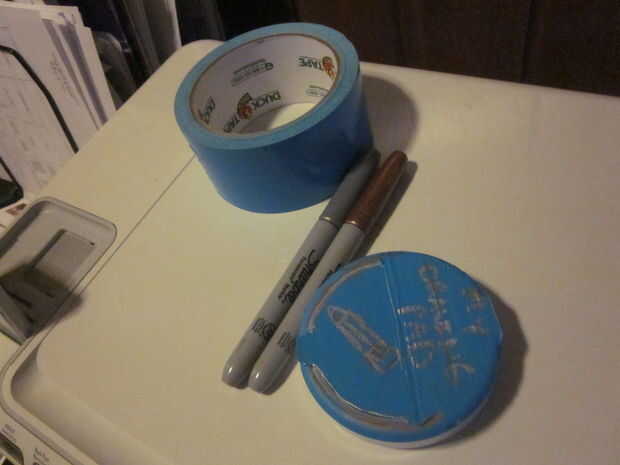 Tiempo de decoración! Pato-cinta semicircular, pero no pega sobre el paquete. Usted sería capaz de dibujar entonces! Si pato cinta encima de la tapa pequeña, a menos que cree que necesita. No lo hice. Ahora, se puede decorar la cubierta con sharpies. O sus marcadores permanentes, por supuesto.