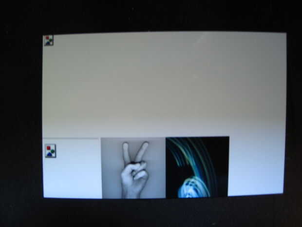 El marco tiene piezas en la parte posterior que se puede plegar para la celebración de la etiqueta interior. Lo que hice fue romper un lado (la tapa) abajo plano, para aceptar las imágenes una vez que se instaló y levantar a otros para ayudar a mantener las imágenes. Alicate de punta fina hacer maravillas aquí.